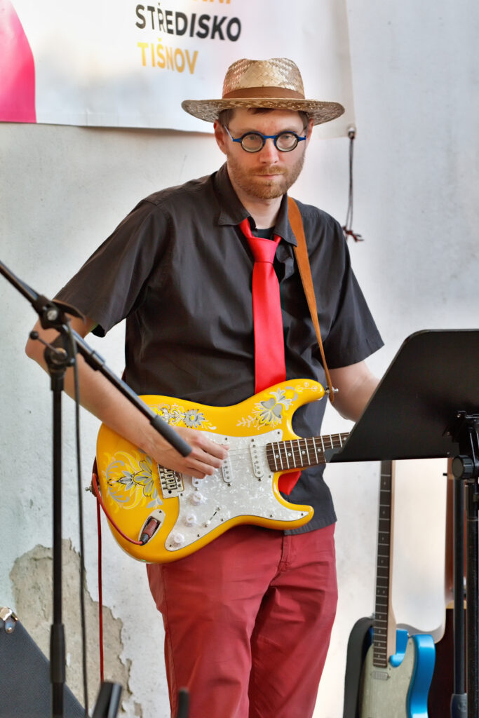 Kytaru jsem zbavil původního laku, vytmelil, přebrousil a odevzdal do lakovny k nabarvení na žlutou barvu. Tím ovšem nebylo všemu snažení konec. Po nalakování šlo tělo kytary za Neří, která na ni namalovala kresby v lidových motivech. Měla v tom docela volnou ruku a dopadlo to podle mě báječně. Kytara na pódiu svítí a dělá radost. Pak šla kytara znovu do lakovny a před sestavením ještě do zad napsal Honza osobní vzkaz.